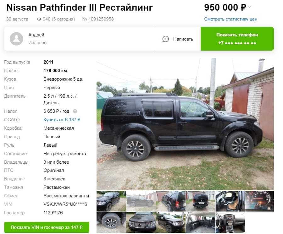 Покупателям третьего Pathfinder предлагается более 300 вариантов на выбор. Большая часть, как показывает статистика avtocod.ru, продается с расчетом ремонтных работ (каждый третий), неоплаченными штрафами (каждый четвертый) и скрученным пробегом (каждый пятый). Реже встречаются автомобили после ДТП, в лизине и залоге, с регистрационными ограничениями и даже после такси.