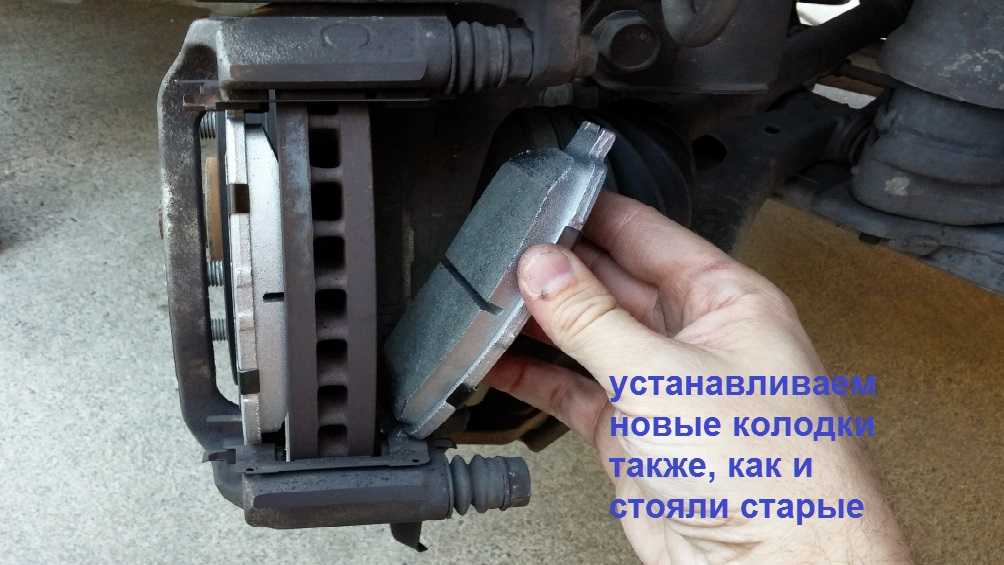 Устанавливаются на место старые тормозные колодки (только основание лучше поставить вместо внутренней колодки) и поднимается корпус скобы.