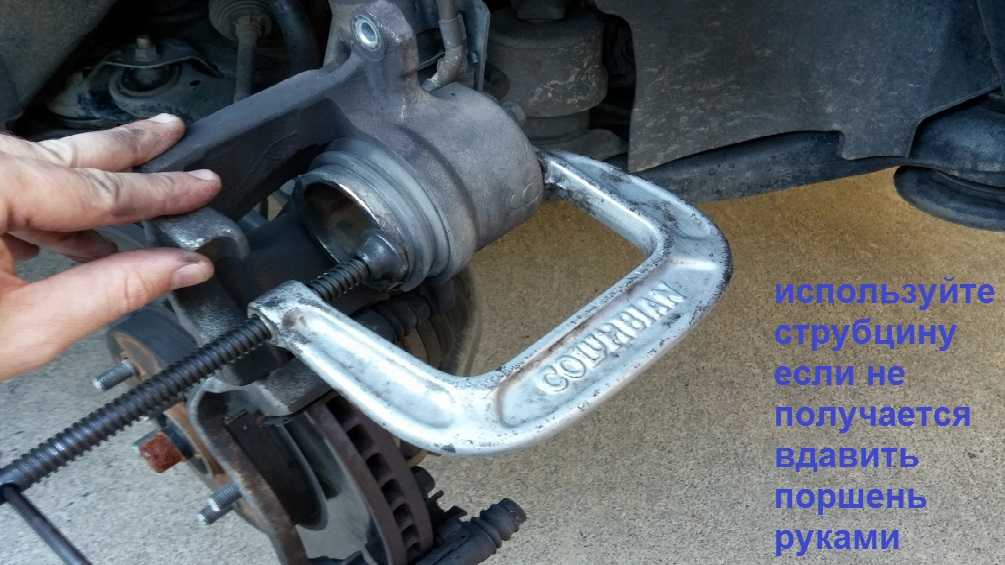 Монтировкой или отверткой надавливается на внутреннюю колодку, при этом опираться нужно на тормозной диск. После этого аккуратно поршень вдавливается в цилиндр.
