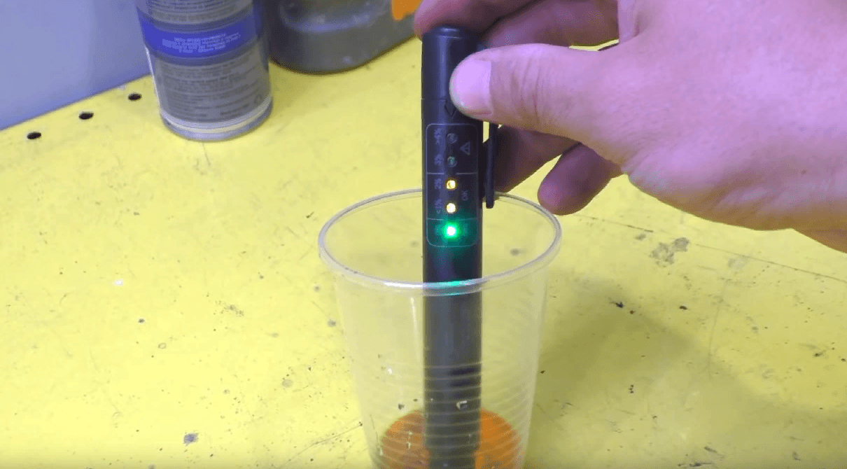 Я скинул уже немного жидкости заднего суппорта. Давайте проверим ее нашим прибором на наличие влаги. Наливаем ее так же в стаканчик и опускаем прибор.