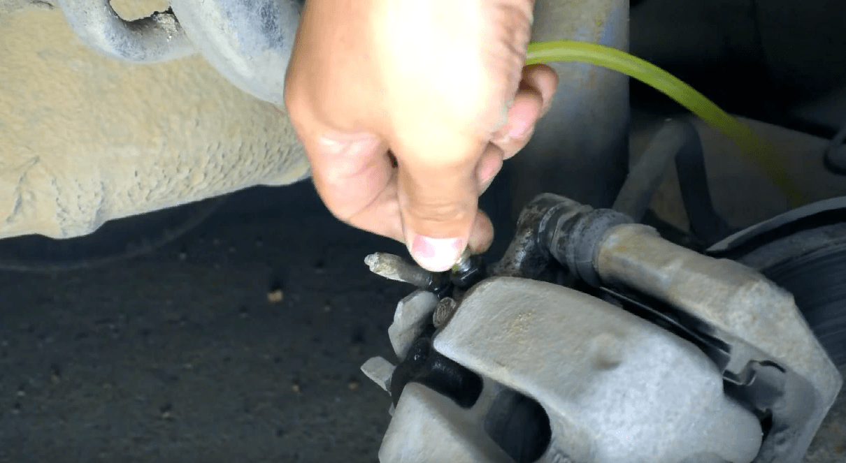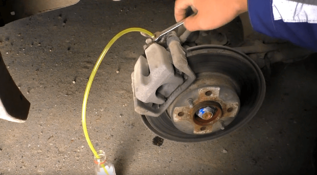 После этого следует одеть на штуцер для прокачки шланг от капельницы. После того как откроете его, дождитесь, чтобы начала течь новая ТЖ. Теперь можно закрыть штуцер и приступить к замене на другом колесе