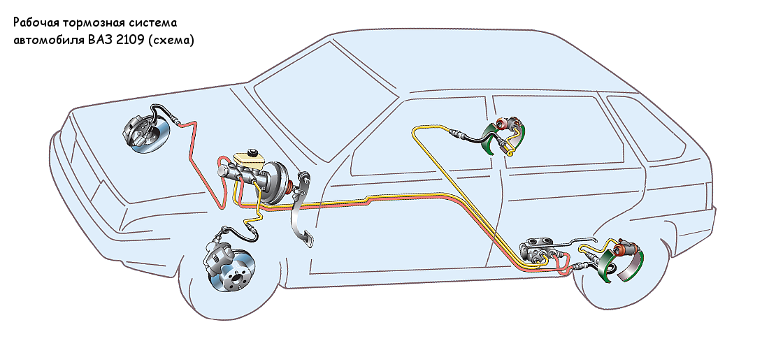 Тормозная система автомобилей ВАЗ 2108, 2109, 21099 гидравлическая, имеет два контура: правое заднее колесо-переднее левое, левое заднее-переднее правое.