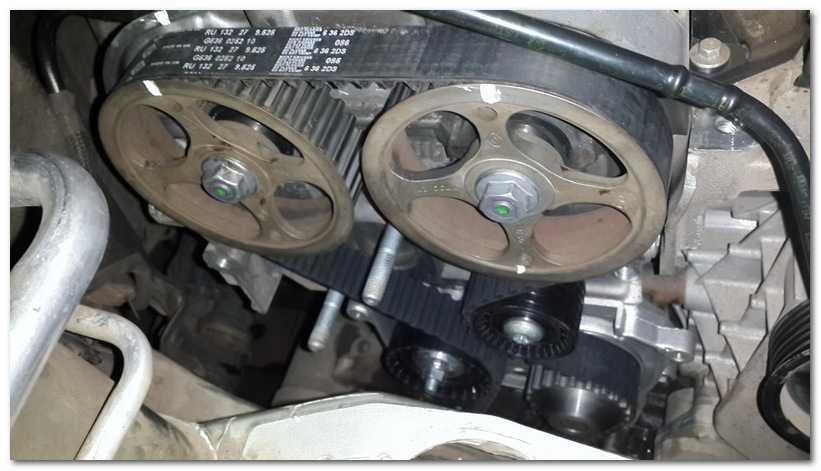 Шкив, к которому приложено сильное сопротивление пружин, требуется сдвигать по часовой, второй шкив корректировать обычно не нужно. После этого ремень натягивают на зубцы коленвала, ролики и насос. После совпадения меток требуется отрегулировать натяжение и собрать конструкцию.