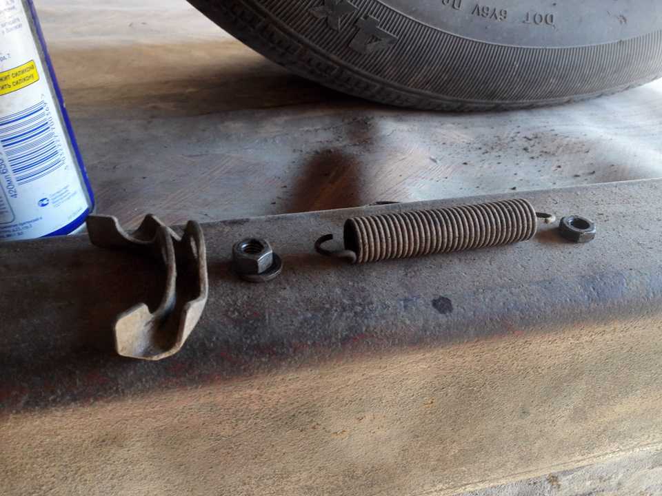 Сначала снимаем пружину и откручиваем контрогайку и гайку, которые натягивают трос. Снимаем шайбу и направляющую пластину. Если натяжная гайка не откручивается, а крутится вместе с передним тросом — WD 40 в помощь и удерживаем плоскогубцами передний трос.