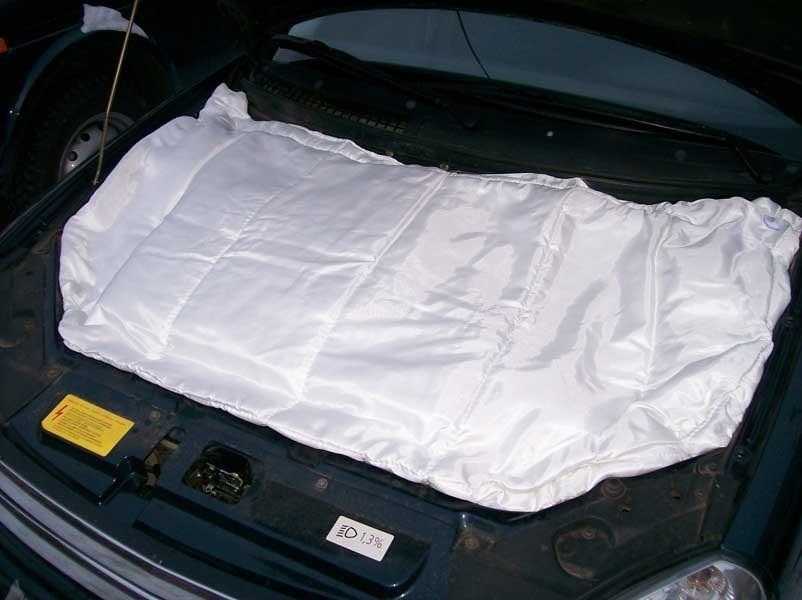 Одеяло выполняется под точную форму подкапотного пространства, и полностью закрывает все элементы мотора, предотвращая утечки тепла. Такой автомобильный трюк приводит к тому, что двигатель остывает почти в два раза медленнее, и прогревается почти в два раза быстрее, при этом масло достаточно быстро начинает прокачиваться по системе.