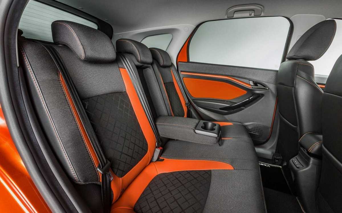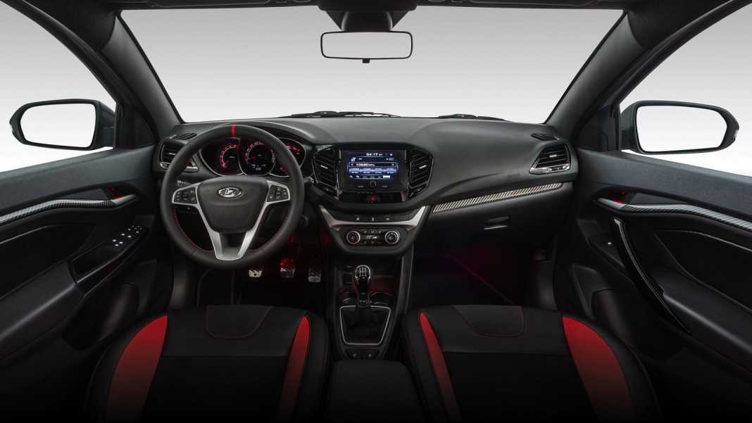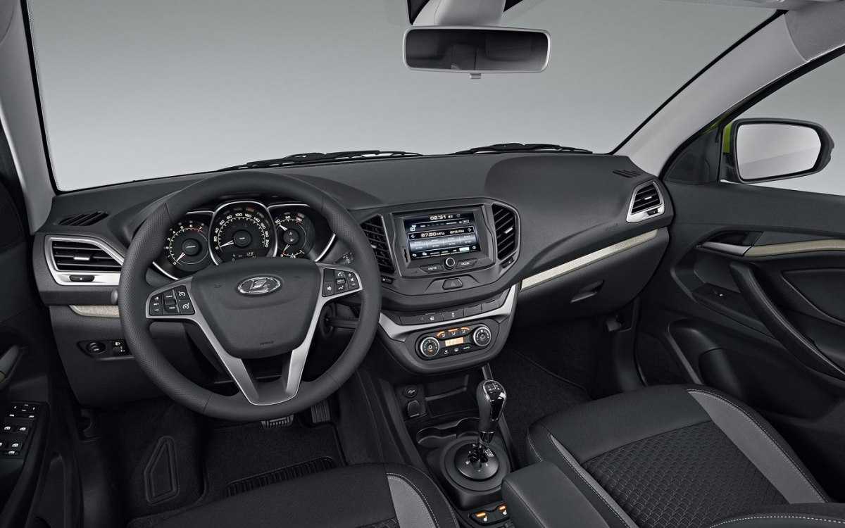 Дизайн салона выдержан в общей стилистике моделей семейства Vesta. Это означает, что внутреннее убранство можно украсить контрастными вставками, проложенными как вдоль сидений, так и по передней панели и дверным картам. На немного выступающей центральной консоли производитель разместил мультимедийный экран и элементы управления климатической установкой. Приборная панель с расположенным по центру спидометром дополняется ярко-оранжевой подсветкой.
