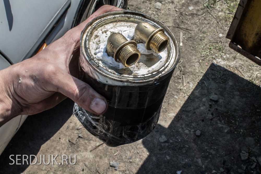 Особенной сложности в сборке нет. Первым делом нужно поставить на один из концов муфты заглушку. В результате получится что-то вроде стакана, только не для чаепития. В ходе эксплуатации самой эффективной конструкции маслоотделителя картерных газов заглушку снимать не придется, а поэтому для лучшей надежности стоит уплотнить ее герметиком. Дальнейшим шагом будет укладка металлической губки на дно цилиндра. Только не нужно заполнять его полностью. В верхней части второй заглушки нужно просверлить два отверстия под заготовленные пластиковые патрубки. Края трубок следует обработать силиконовой смазкой и установить в подготовленные отверстия.