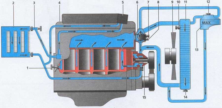 Прежде, чем приступить непосредственно к рассмотрению деталей и улов, которые входят в систему охлаждения мотора стоит рассмотреть, схему устройства узла.