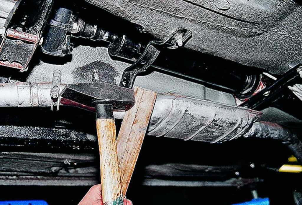 - Аккуратно выбейте резонатор из крепления, ударяя молотком через прокладку.