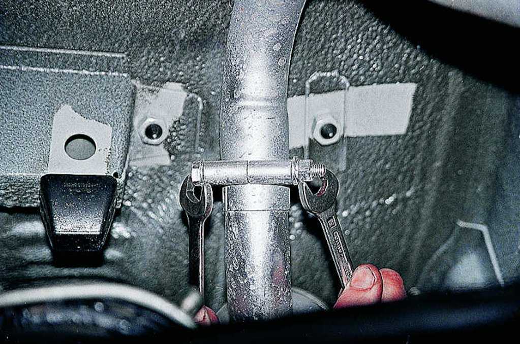Открутите гаечным ключом крепление выхлопной трубы к резиновой подушке