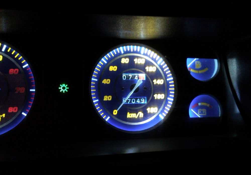 - спидометр — показывает скорость движения транспортного средства, при этом счетчик внизу показывает общий пробег машины, а верхний отвечает за локальный километраж (при необходимости данные сбрасываются);
