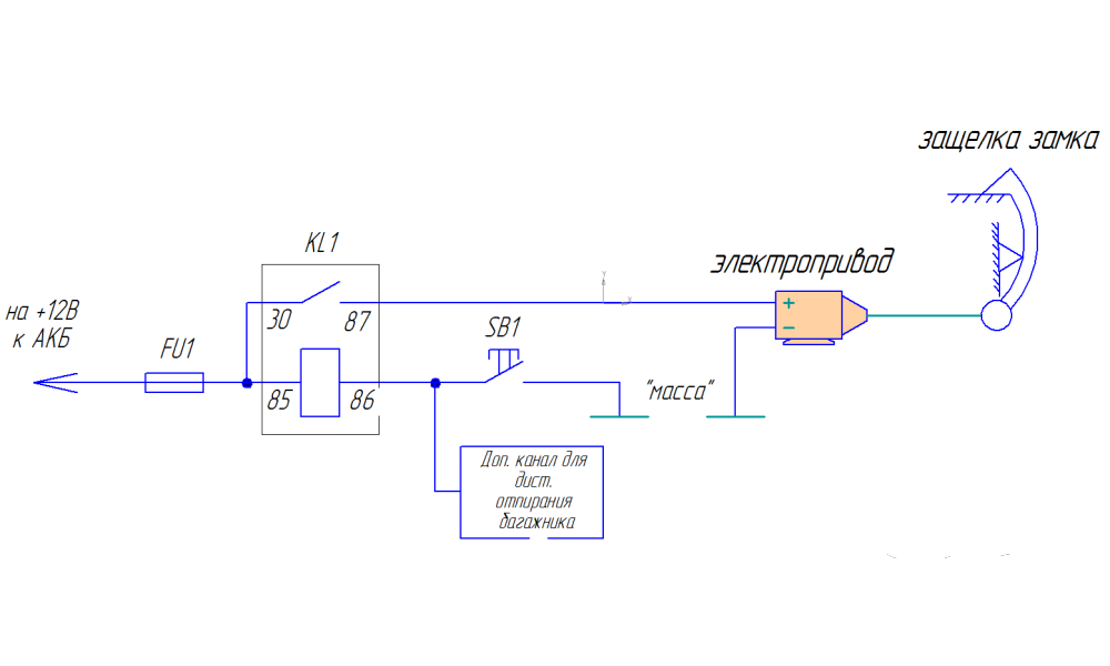 Что делать, если никакой личинки и системы тяг на дверце нет, а есть только кнопка? Причем как раз коррозия контактов этих кнопок не даёт открыть багажник. В подобных автомобилях за управление электроприводом багажника управляет бортовой коммутационный модуль — BCM. Для принудительного открытия замка багажника замыкаем вывод, к которому подключена неисправная кнопка, на «массу». На Nissan Qashqai схема управления замком выглядит так: