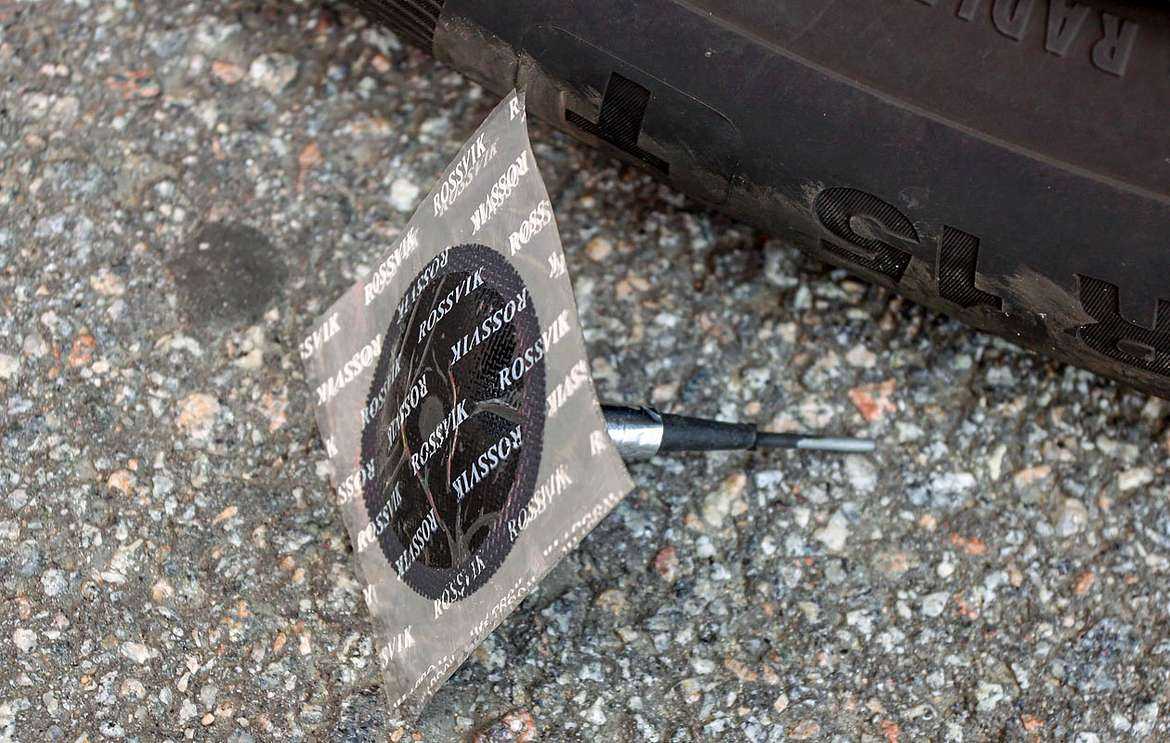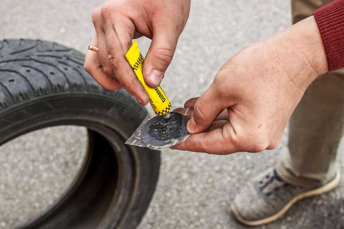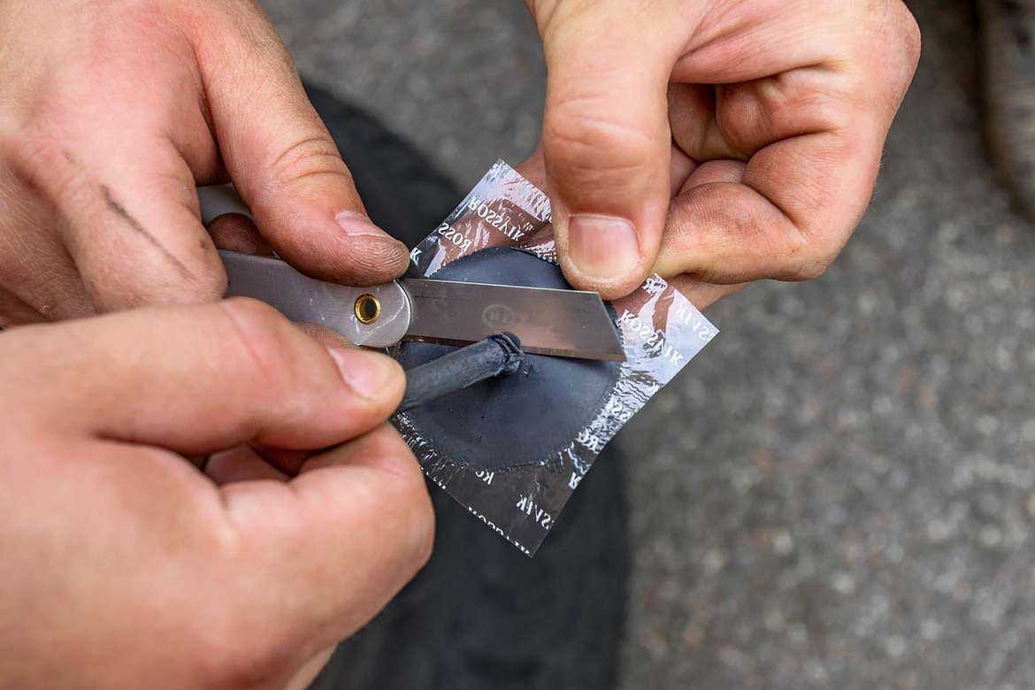 Имитируя полевые условия, мы протерли место прокола салфеткой, намазали заплатку клеем-активатором из набора ATRK‑3 и придавили место прокола ногой на несколько минут. Как оказалось, этого тоже было достаточно. Собранная шина ни за несколько часов, ни за сутки не спустила.