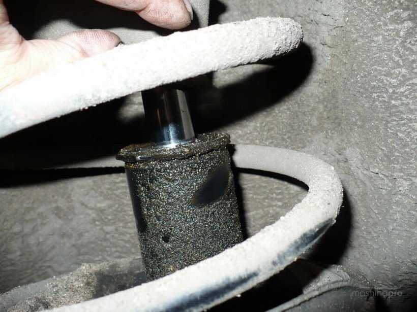 - Полностью выкручиваем гайку крепления штока амортизатора и снимаем опору (после этого можно проверить работоспособность амортизатора, проверить состояние пыльника и отбойника).