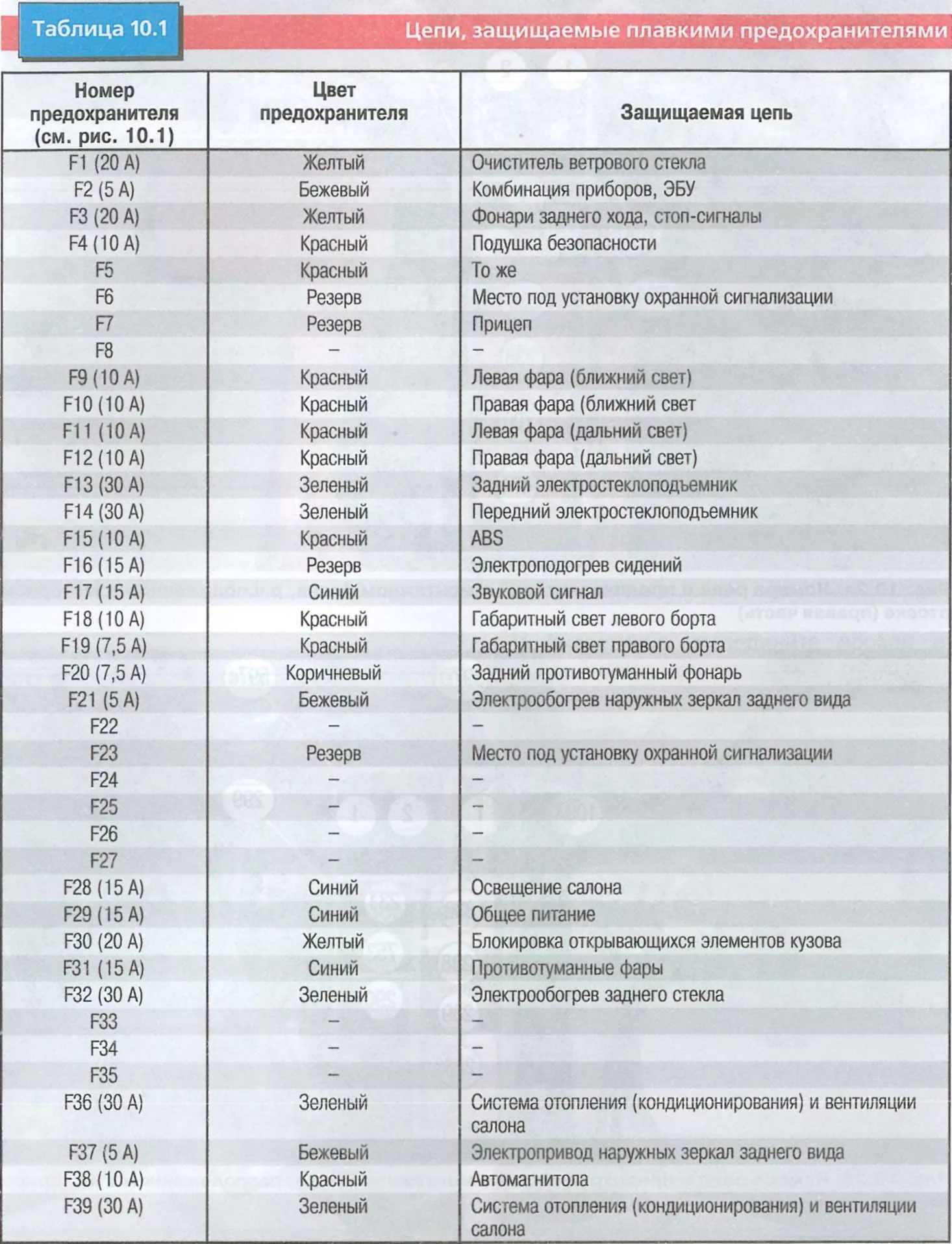 - 10А — Кондиционер, диагностический разъем, зеркало заднего вида, регулятор фар