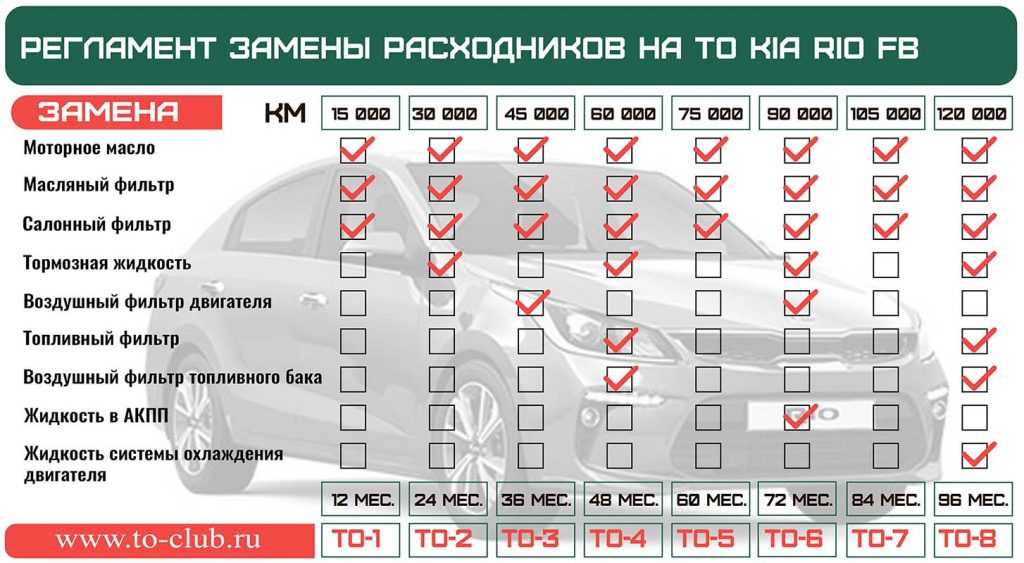 Цены на ТО Kia Rio, представленные в данной таблице, носят рекомендательный характер и являются примерными. Конечная стоимость будет зависеть от вашего города, конкретного дилера, стоимости запчастей, работ и прочих условий вашего региона. Информация взята с официального сайта производителя и актуальна на 2020 год.
