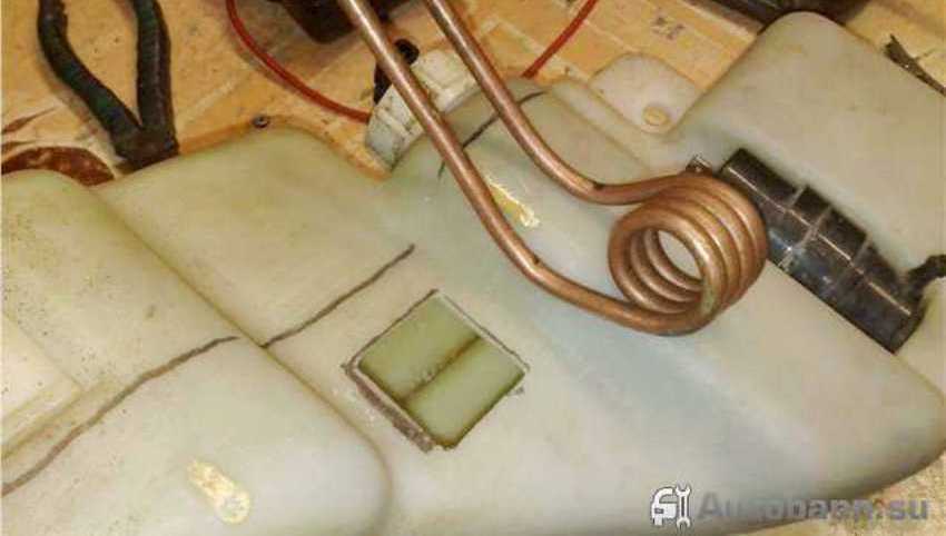 Обязательно учтите удобство добавления жидкости в бачок, также отверстия и трубки не должны мешать насосу и датчику уровня незамерзайки. Выбрав подходящие место, сделайте 2 отверстия. Они не должны слишком превышать размеры трубки. Трубка изгибается в виде спирали. В принципе можно оставить ее и прямой. Это сильно на ходовые качества не повлияет. Аккуратно вставляем получившийся нагревательный элемент в бачок. Здесь более удобной окажется гибкая медная трубка. Вставив ее на место, нужно загерметизировать отверстия специальными средствами.