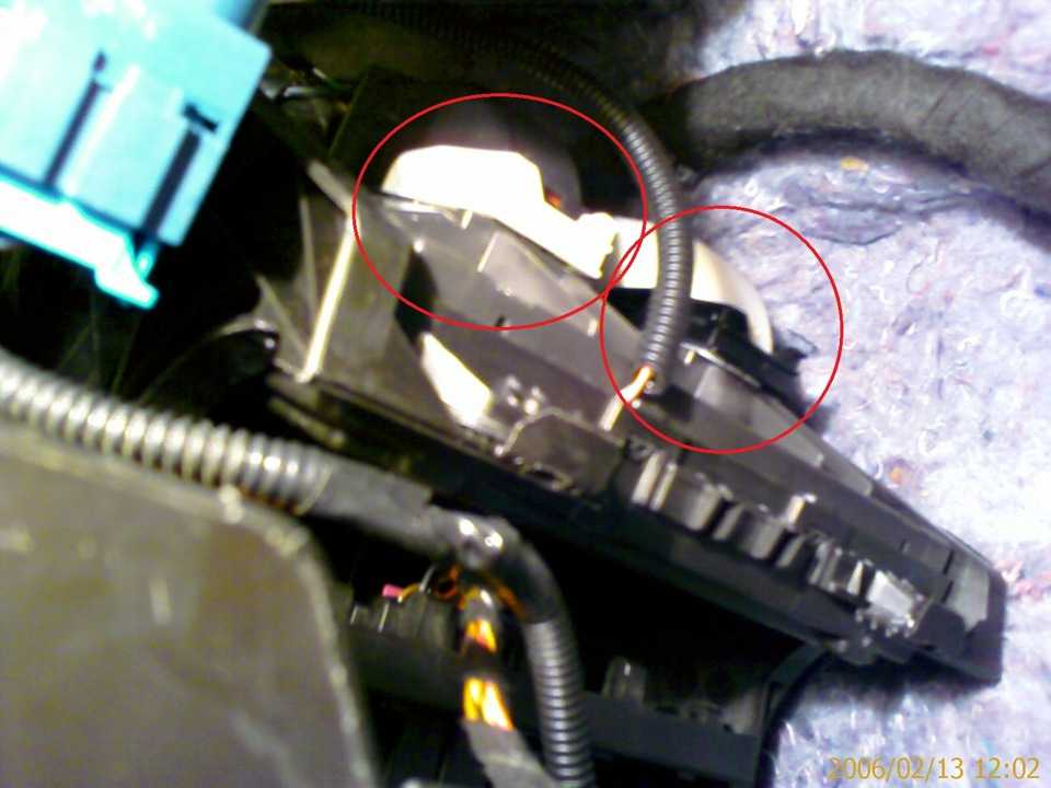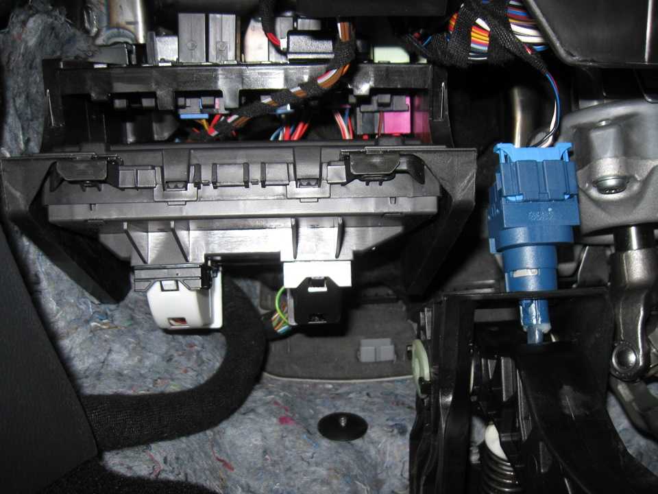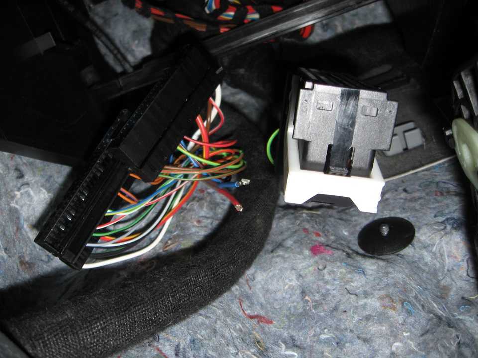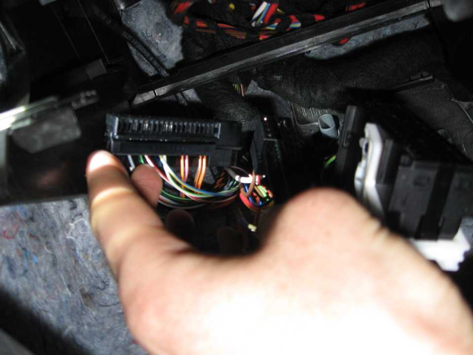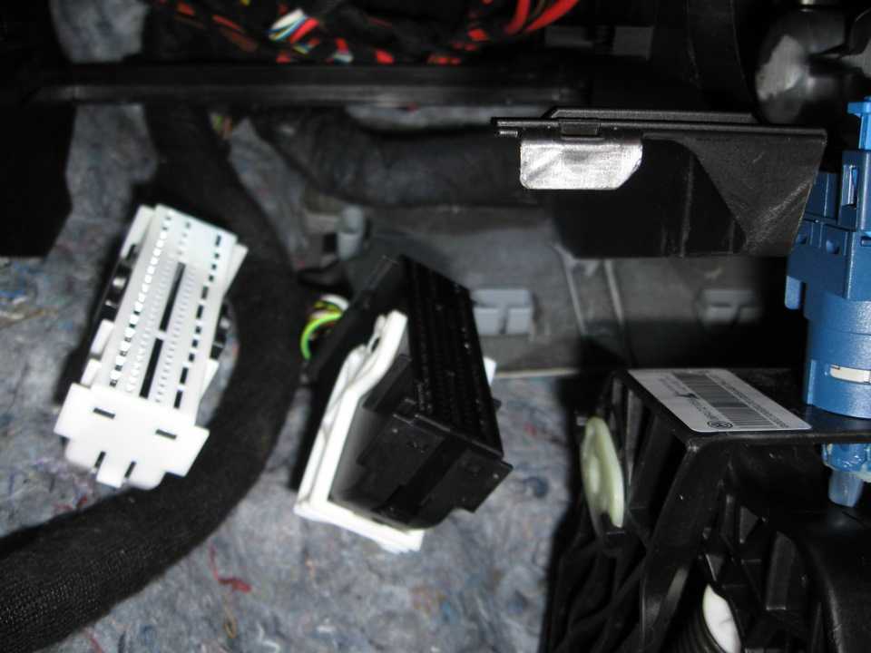 5) И возвращаемся под руль, к разъемам блока электроники, по пути протягивая ранее заготовленный шнур CAN шины под рулевой колонкой (на фото слева).