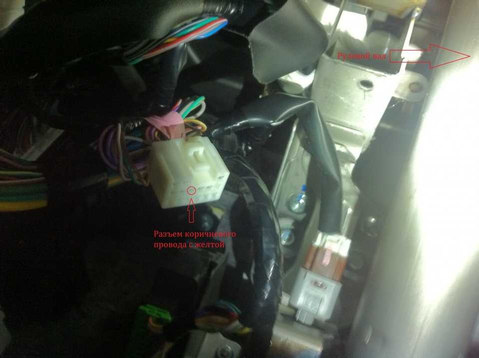 Теперь нужно сделать, чтобы Pioneer понимал, когда ему включать изображение с камеры заднего вида. Для этого нужно найти (+) фонаря заднего хода рядом с блоком предохранителей (на субару хв это коричневый провод с желтой полосой). Нужно посмотреть какого цвета провод идет к лампе заднего хода и найти такой же в блоке предохранителей. Искал я его минут 10, но нашел. На самом деле он вполне доступен. Стоит заглянуть под руль, и вот он этот коннектор.