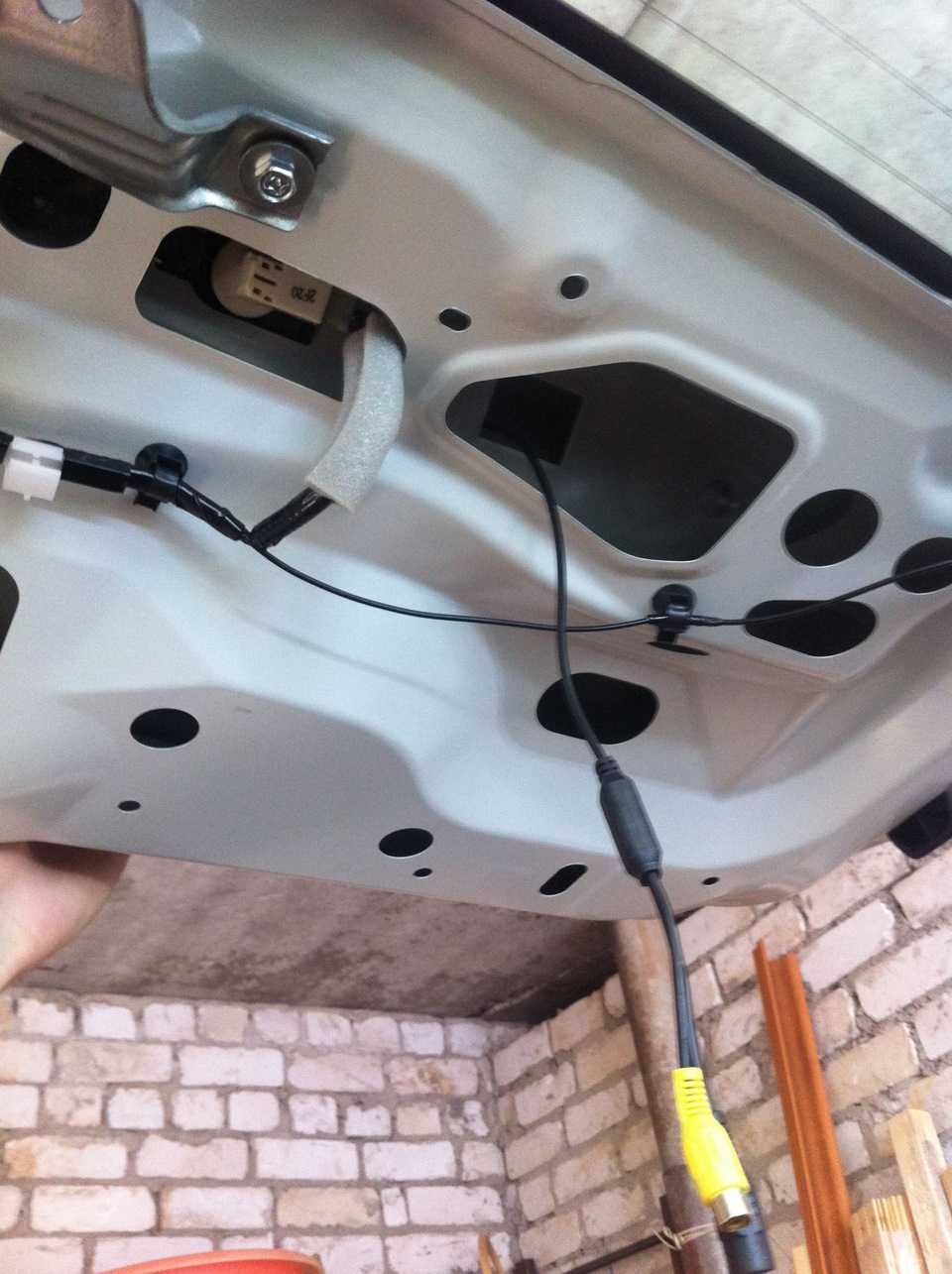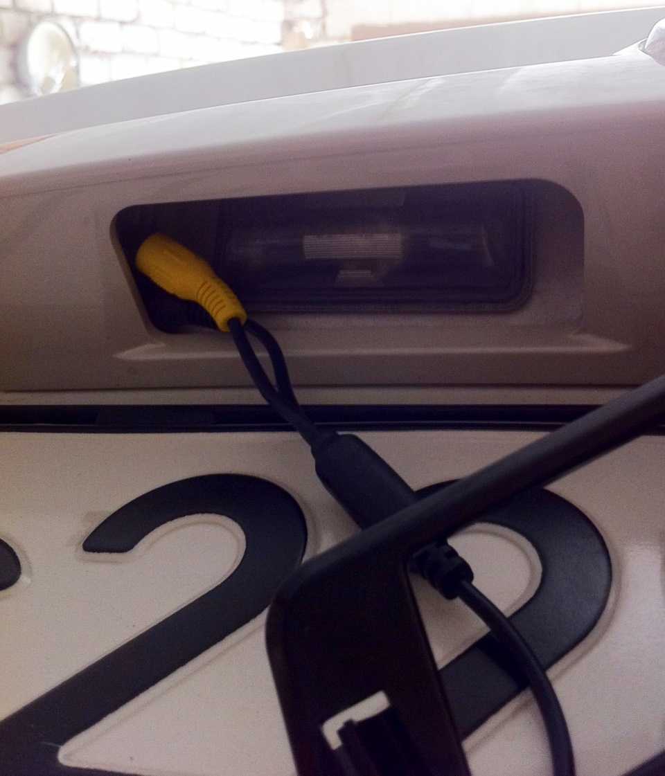 Протягиваем кабеля от задней к передней стойке автомобиля. Питание монитора также подключаем к заднему фонарю, поскольку он ничего не потребляет, если отсутствует сигнал. Это немаловажный аспект. Постоянная работа камеры заднего хода попросту выведет ее из строя. Важно хорошо припаять дома и клеммы к питанию подсветки номера на видеокамере. В завершение соединяем питание и сигнал камеры, прикручиваем камеру на место и собираем разобранный пластик автомобиля.