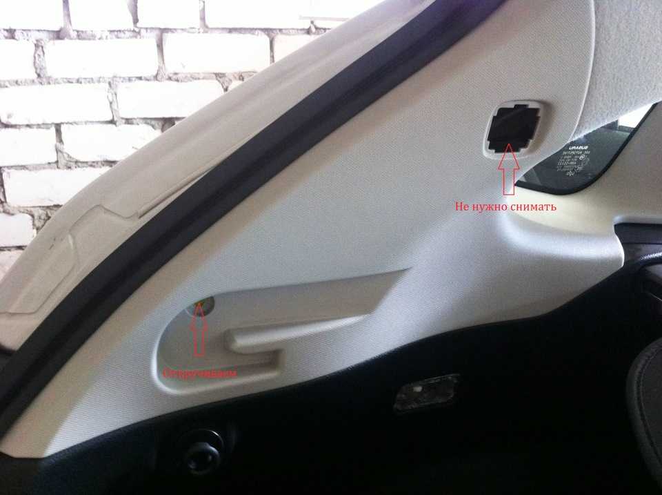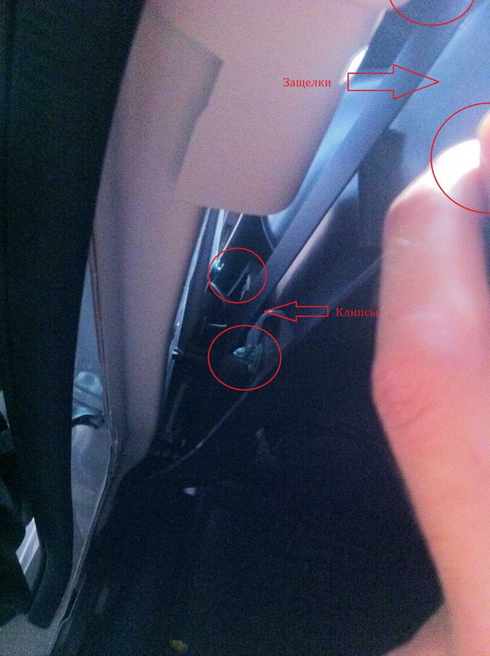 Обшивка на центральной стойке сверху держится на защелках, которые нужно отогнуть пальцами, снизу на зеленых клипсах.