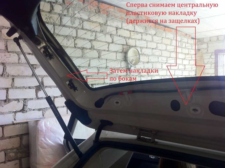 Процесс установки начинается с крышки багажника. Для этого необходимо снять всю обшивку 5й двери. Делается это следующим образом