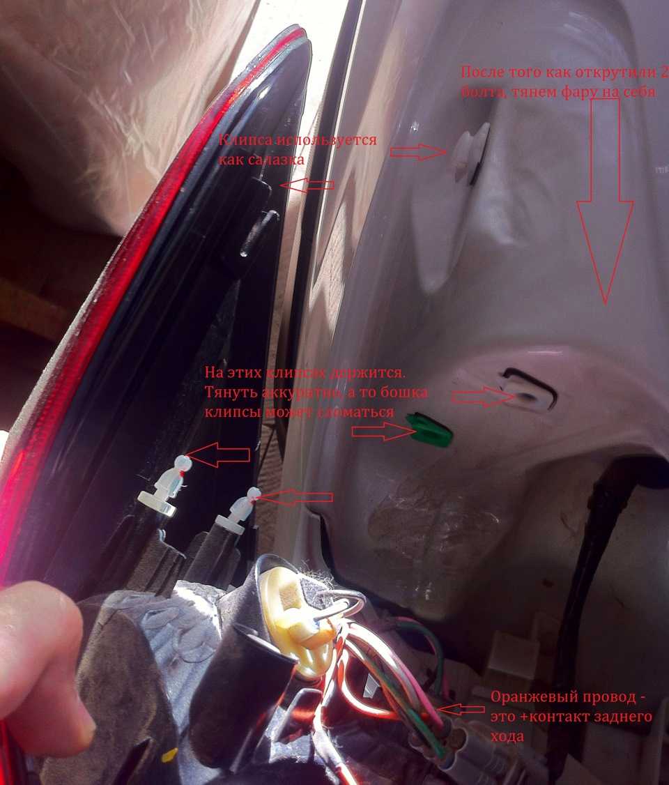 Ищем оранжевый провод, к нему то там и нужно подцепиться. Я снял коннектор, подсунул туда +контакт камеры и прижал, одев коннектор обратно. Ставим фару на место, а -контакт камеры кидаем на массу в любое место. Желательно сразу подключить камеру к монитору и проверить работоспособность, чтобы потом не возвращаться к багажнику )
