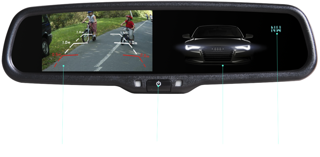 Зеркало заднего вида, на которое устанавливается маленький монитор. В принципе неплохо, так как можно использовать беспроводную гарнитуру и зеркальное отражение. Но на зеркало нет возможности ставить большой монитор и поэтому картинка видна не четко;