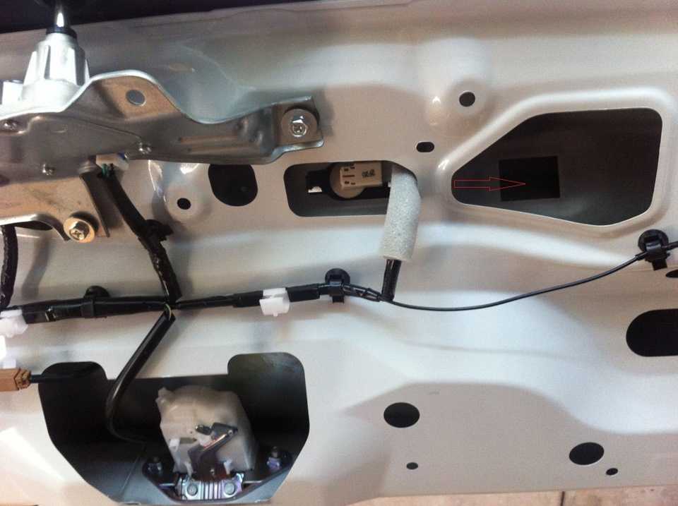 Теперь нужно протяну RCA до мафона. Сняв уплотнитель в задней части двери, прокладываем кабель сквозь щель.