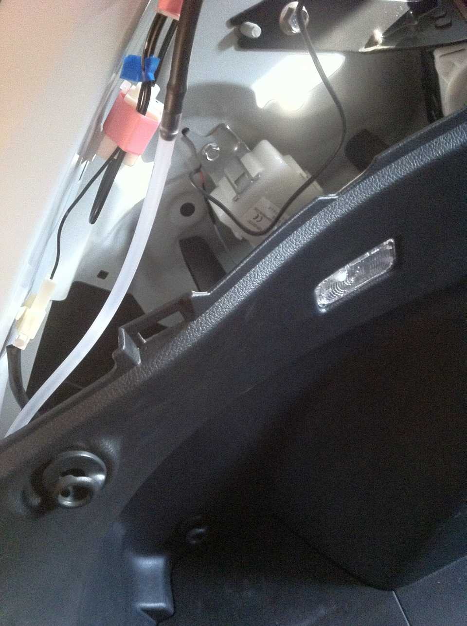 Снимаем декоративную вставку-«решетку» на левой стенке багажника, видим разъем, разъединяем его(на фото провод, у вас его нет, позже будет если займетесь такой же ерундой):
