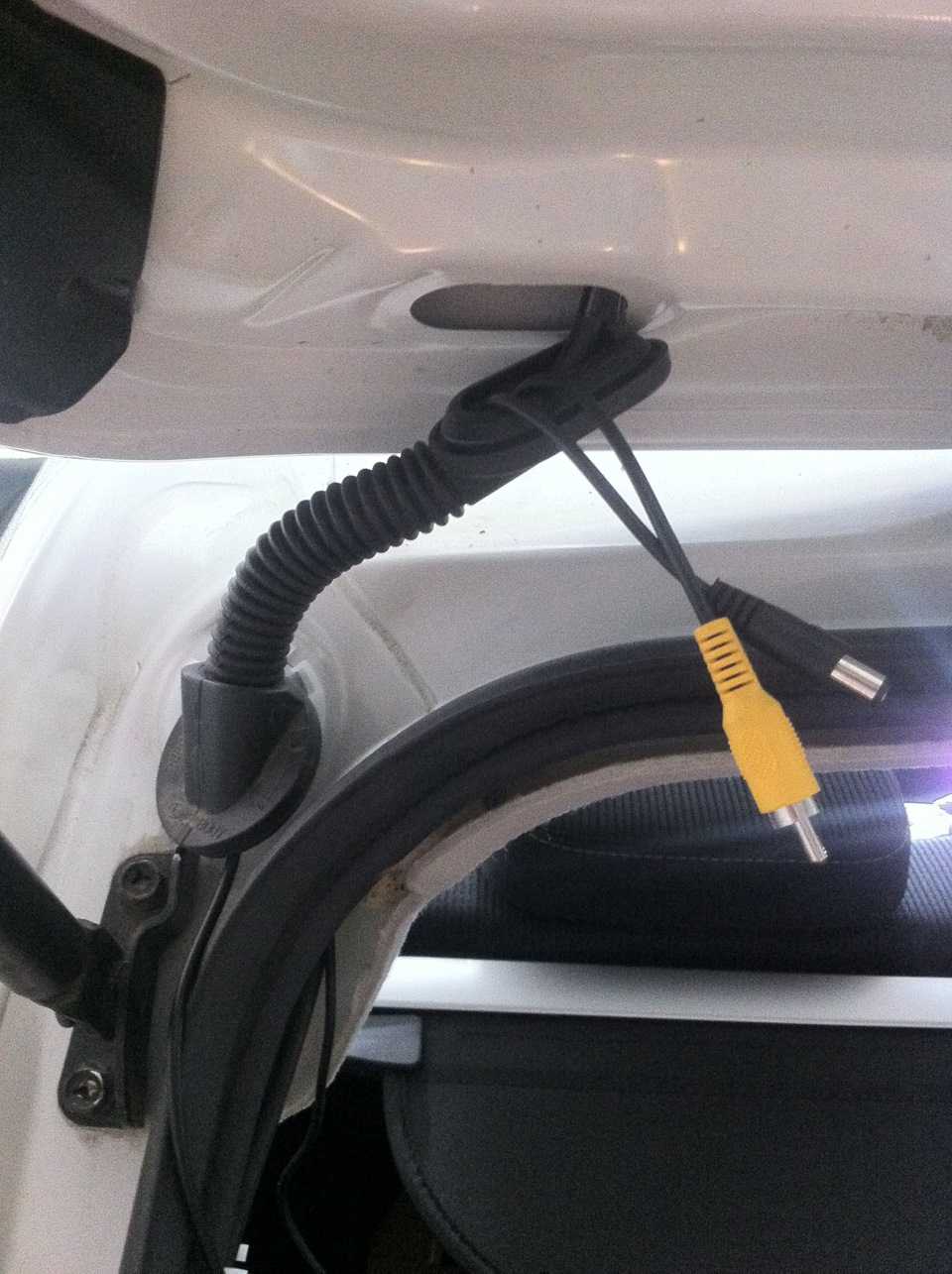 Пропускаем провода питания камеры и видео сигнала вдоль проводов питания подсветки номера, потом между пенопластом и кузовом, выводим в открытое окошко: