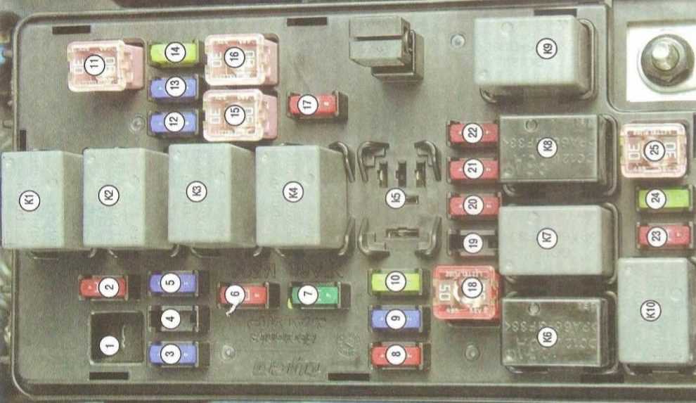 - Блок в подкапотном пространстве. Если снять крышку блока, то можно обнаружить наличие не только защитных устройств, но и реле. Этот блок является основным, так как именно здесь находятся устройства, отвечающие за защиту цепи замка зажигания
