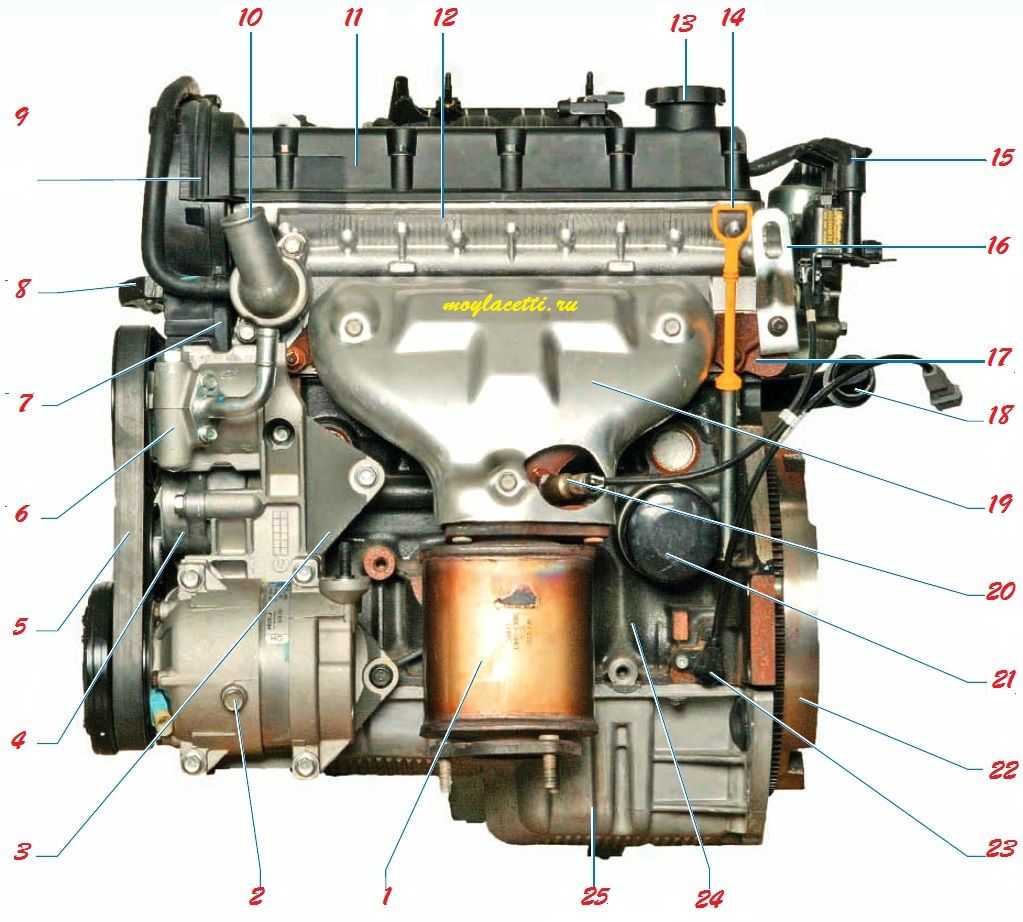 Двигатель Лачетти (вид слева по ходу автомобиля)