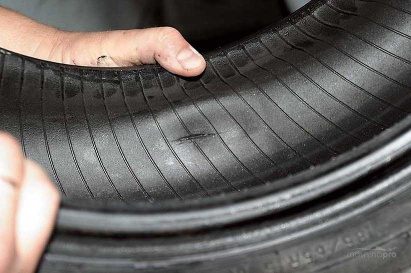 - Размер продольного повреждения бескамерной автопокрышки более – 35 мм, у резины с камерой свыше – 45 мм.