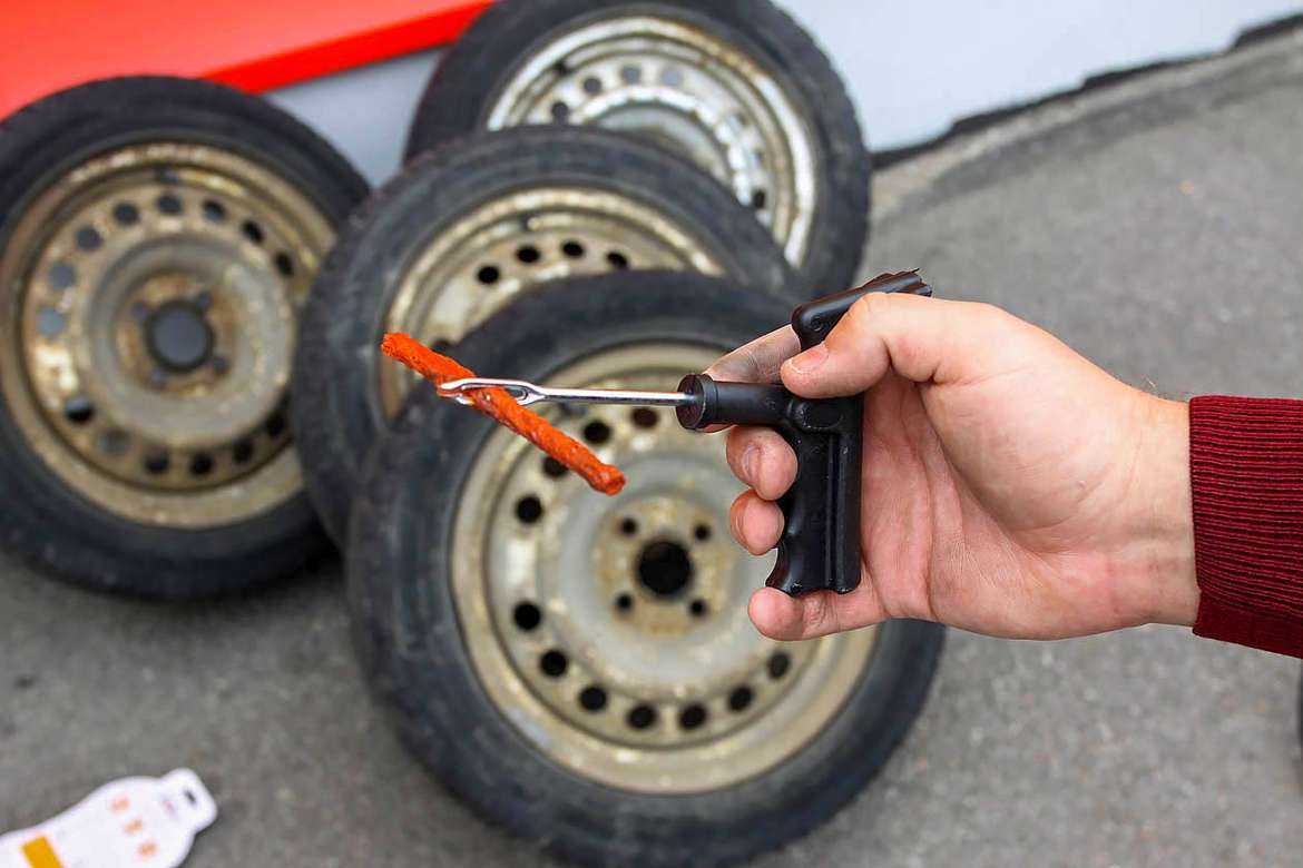 Если повреждена бескамерная шина, то помимо вышеуказанных способов можно предложить еще один. В автомагазинах продаются специальные наборы, куда входит резиновый жгут, специальное шило, а также металлический вороток.