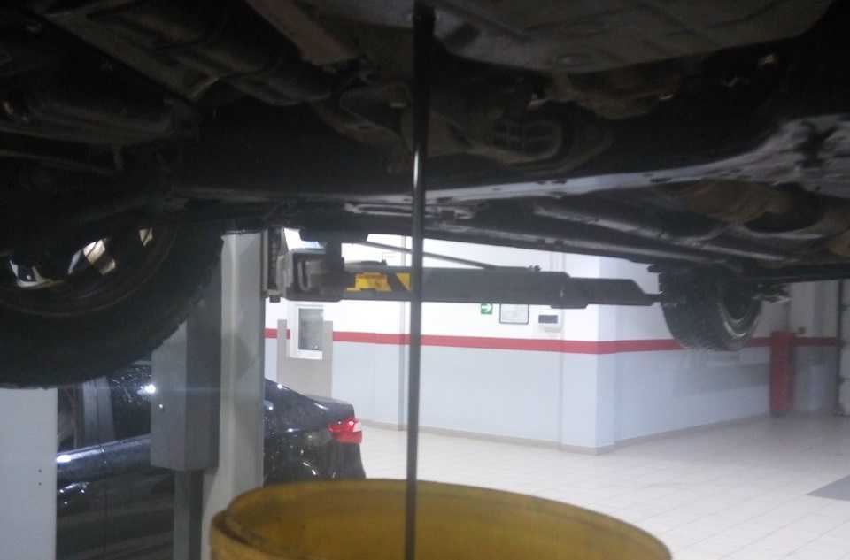 - Установить автомобиль на смотровую яму или поднять на автоподъемнике. В крайнем случае, можно приподнять машину при помощи домкрата.