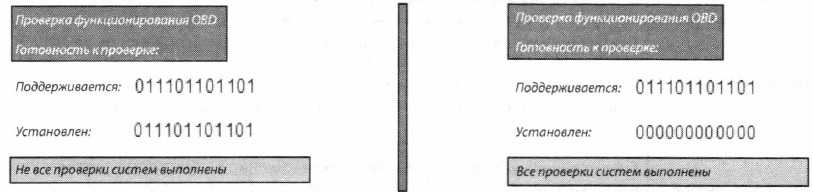 Если позиция в коде равна 1, значит, соответствующая система еще не завершила цикл проверки. Если позиция в коде равна 0, значит система завершила цикл проверки или не установлена в автомобиле. Последняя позиция в коде готовности (12) всегда равна 0. Некоторые диагностические тестеры не отображают ее на дисплее. Код готовности считывается справа налево.
