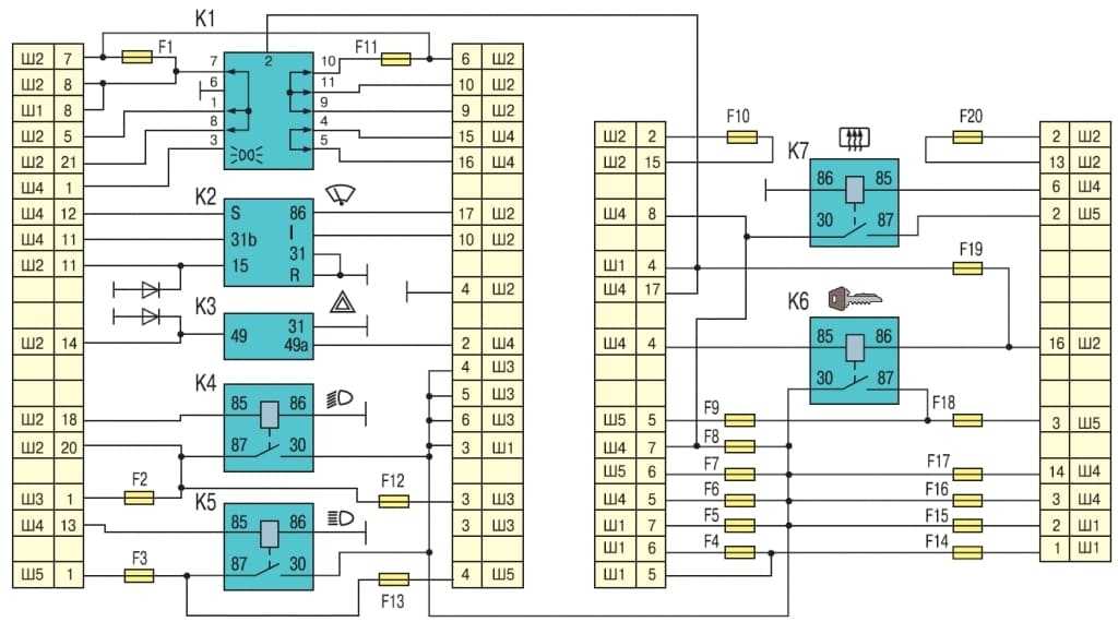 | F11 (8А) | Лампы указателей поворота и реле-прерыватель указателей поворота и аварийной сигнализации (в режиме аварийной сигнализации) |