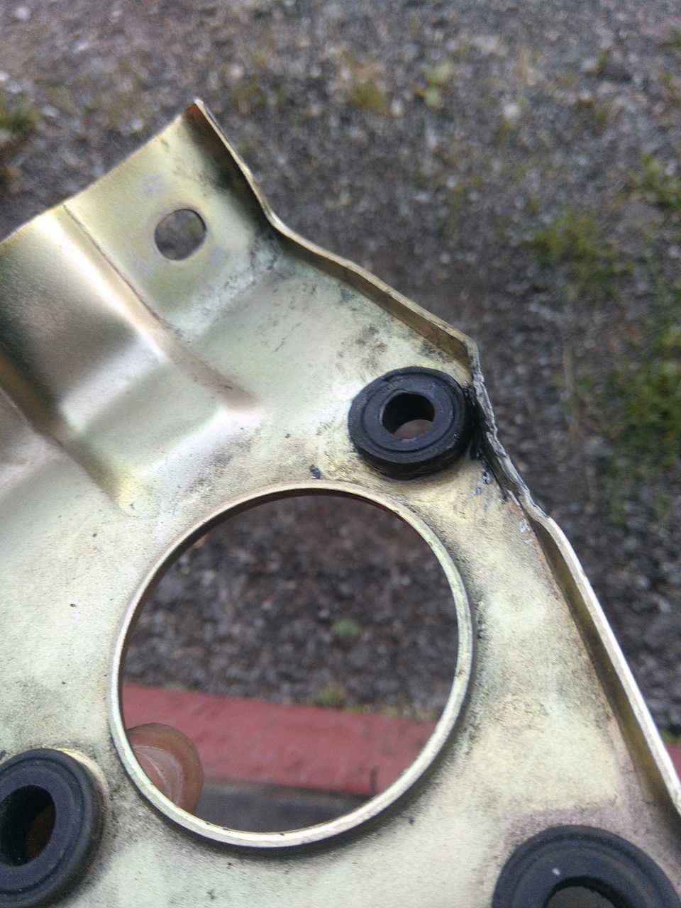 Снял демпферную резинку. После чего пошли в ход молоток, разводной ключ, плоскогубцы, тиски и такая-то мать…В процессе выгибания, щит пытается выгнуться по отверстию для демпферной резинки и приводит к тому, что края отверстия оказываются не в одной плоскости и демпферная резинка плохо устанавливается.Для того, чтобы плоскость не уходила, можно в отверстие установить болт диаметром 12 мм (лучше 14, но таких фиг найдешь) и с двух сторон прижать отверстие гайками. Тогда само отверстие (во время изгибания края щита) выгибаться не будет.В итоге получил вот такой результат: